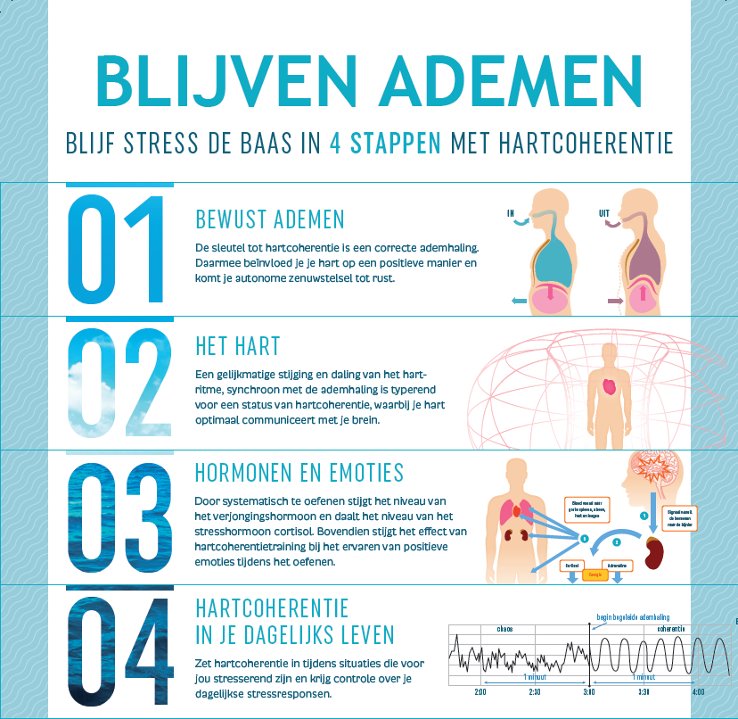 Tijdens de hartcoherentie training oefenen we op regelmatige basis de focus ademhaling, waardoor het hart in een bepaalde staat komt die het brein in balans brengt. Tijdens de training bouw je een vaardigheid op in het creëren van balans in je brein dankzij je hart, het is BLIJF STRESS DE BAAS IN die vaardigheid die je uiteindelijk de veerkracht zal geven om beter met stress om te kunnen. Je kijk op de situatie verandert omdat je meer vanuit balans je context beleeft dan vanuit een oersysteem met een overprikkelend emotioneel brein. Dat is het wonder van hartcoherentie.